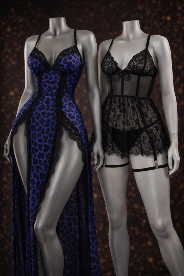 Cesur ve sofistike bir görünüm sunan bu uzun gecelik, mavi leopar deseni ve zarif siyah dantel detaylarıyla göz alıcı bir stil yaratır. Vücuda oturan formu feminen hatları ön plana çıkarırken, derin yırtmaç detayı hareket özgürlüğü ve çekici bir siluet sağlar.
