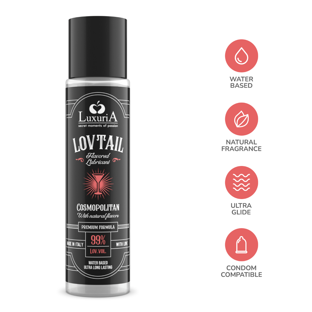 Lovtail Cosmopolitan Mutlu saatlere hazır mısınız? Luxuria Lovtail, en ünlü kokteyllerin kokusunu taşıyan, samimi, su bazlı bir kayganlaştırıcıdır! Şehvetli kokusu sizi bir yaz gecesinin zevklerine götürecek ve sizi zevk sunmaya hazır bir aşk barmenine dönüştürecek! Ultra pürüzsüz ve kalıcı dokusuyla hem kayganlaştırıcı hem de masaj jeli olarak kullanılabilir. Her türlü seks oyuncağıyla güvenle kullanılabilir. Paraben ve boya içermeyen formülü sayesinde, samimi ilişkilerinizin tüm keyfini güvenle çıkarabilirsiniz.