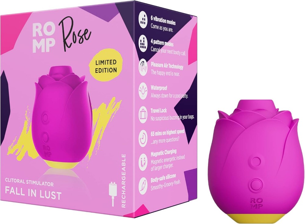 ROMP Rose, temassız hava basıncı dalgalarını kullanarak çığır açan vakum benzeri bir his sağlayan orijinal Pleasure Air Teknolojisi'ne sahip benzersiz bir klitoral uyarıcıdır. ROMP Rose'un sıra dışı şekli, orgazmı ön plana çıkarmak için tasarlanmıştır ve 6 yoğunluk ve 4 desen modu sunar; hepsi giriş seviyesi bir fiyata, yüksek kaliteli, şarj edilebilir, silikon kaplı bir oyuncakta. Pleasure Air Teknolojisi, klitorisle doğrudan temas etmeden titreşimli ve masajlı hava basıncı değişiklikleri arasında mükemmel bir denge sunar. Bu sayede, yaklaşık 8.000 sinir ucu asla aşırı uyarılmaz ve sizi yeni ve sıra dışı bir orgazma götürür.