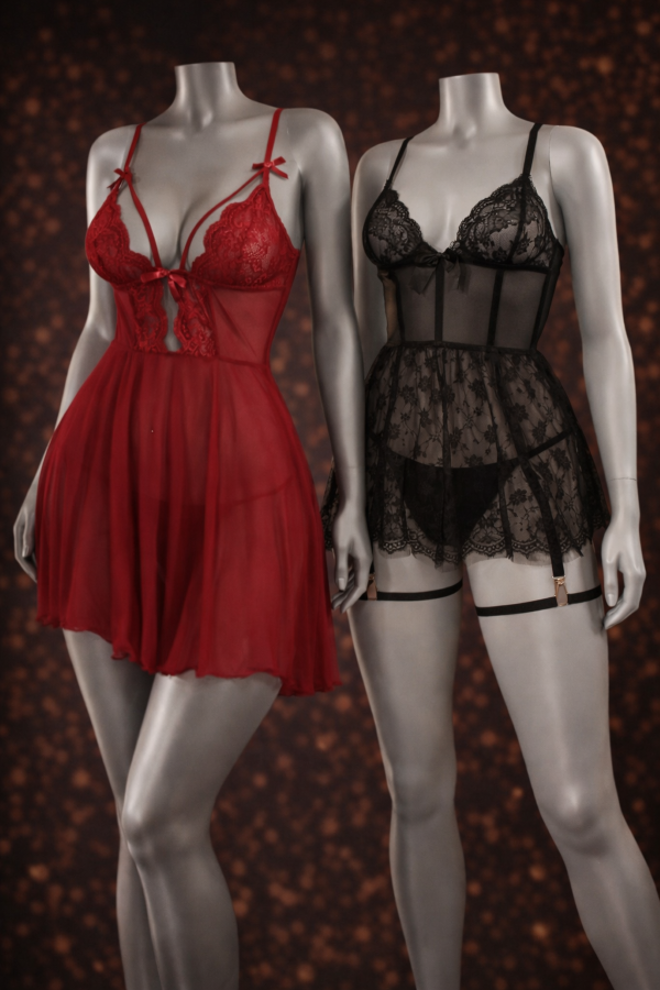 0212 211 00 28 0546 211 00 28Siyah-Kırmızı Dantel Detaylı Göğüs Dekolteli Şık Transparan Tül Kadın Fantezi Gecelik Takımı Avantajlı 2 li Paket